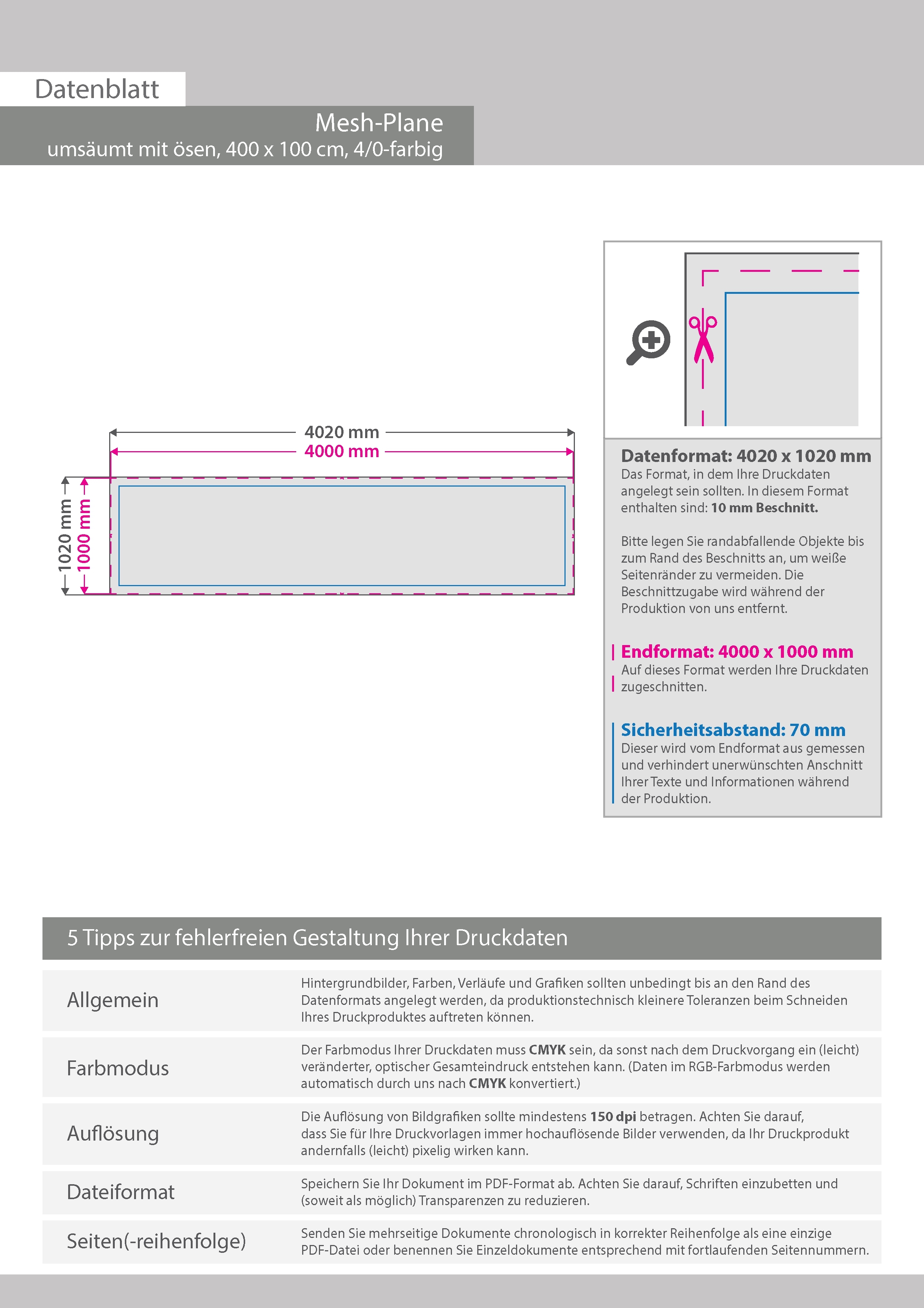Hochwertige Mesh-Plane 400 x 100 cm, 4/0-farbig bedruckt, Umsäumt + Ösen im Abstand von 50 cm links und rechts
