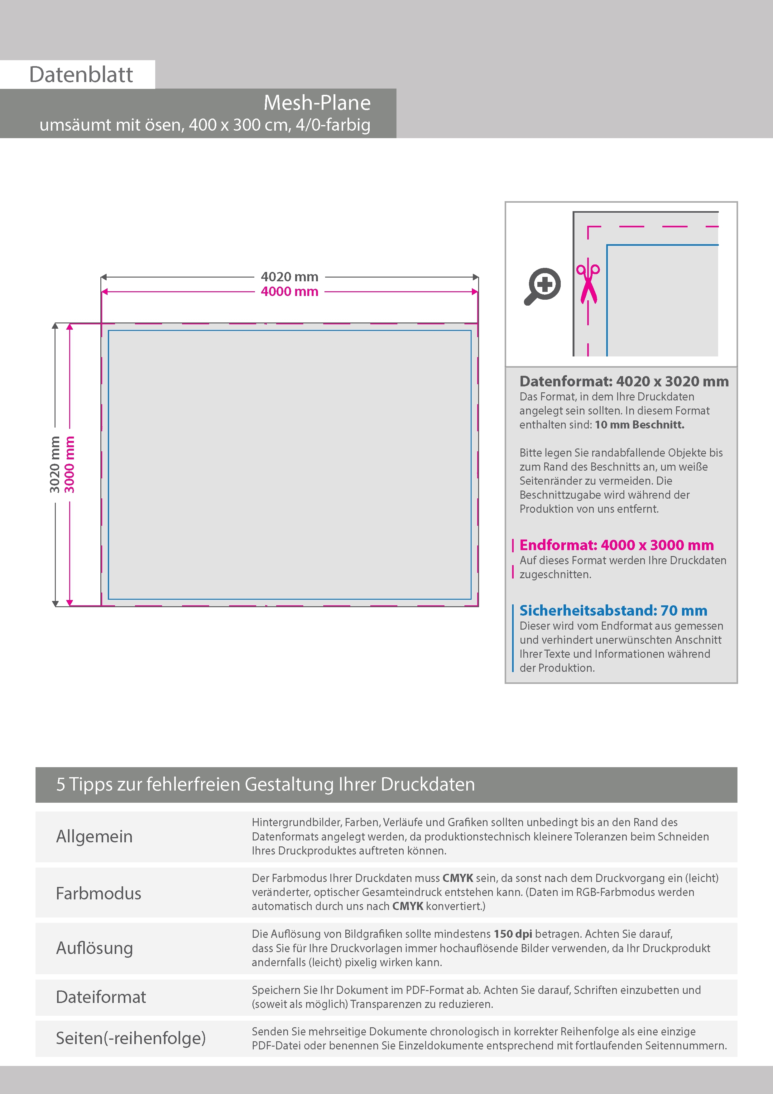 Hochwertige Mesh-Plane 400 x 300 cm, 4/0-farbig bedruckt, Umsäumt + Ösen im Abstand von 50 cm links und rechts