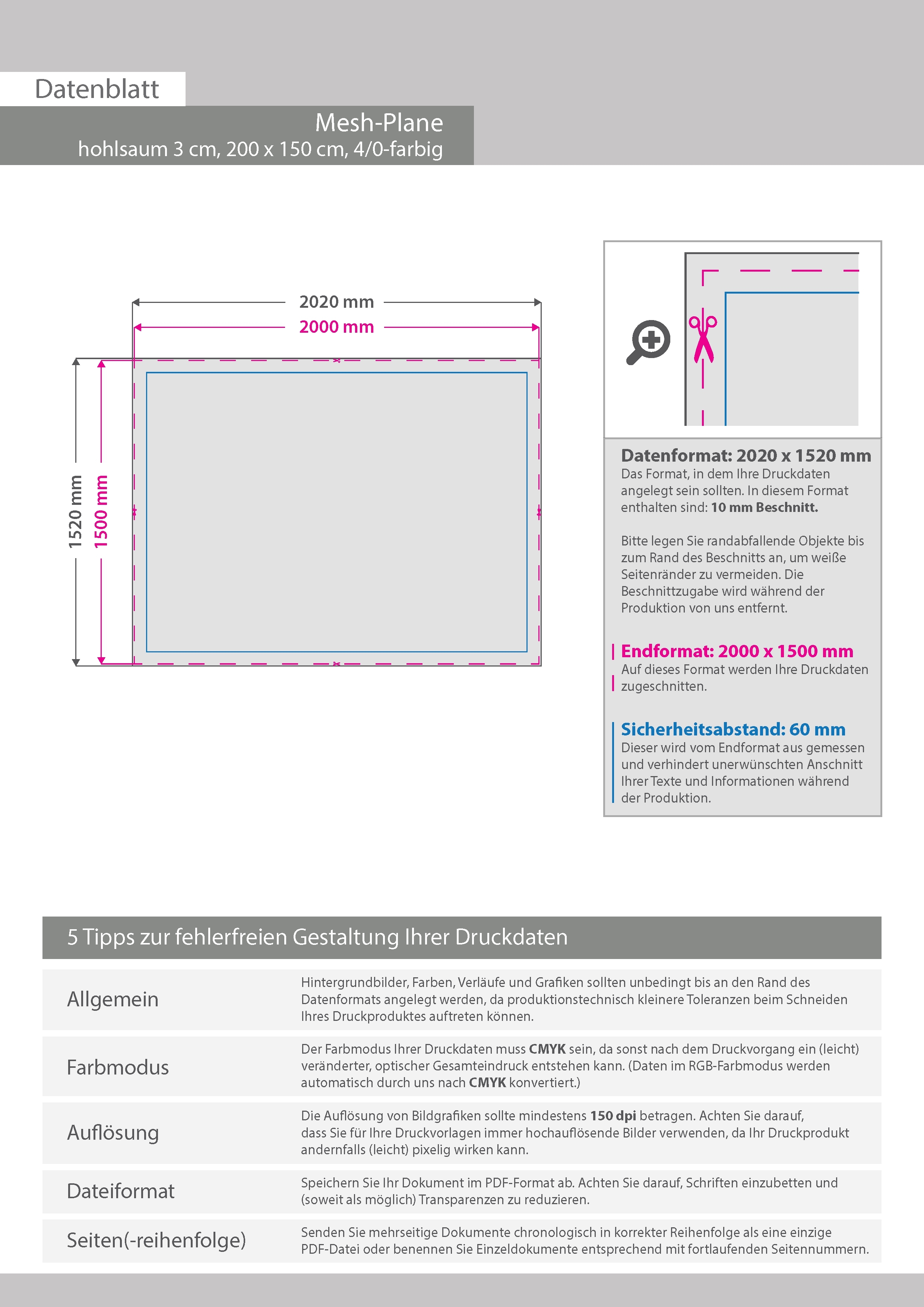 Hochwertige Mesh-Plane 200 x 150 cm, 4/0-farbig bedruckt, Hohlsaum oben und unten (Durchmesser Hohlsaum 3,0 cm)