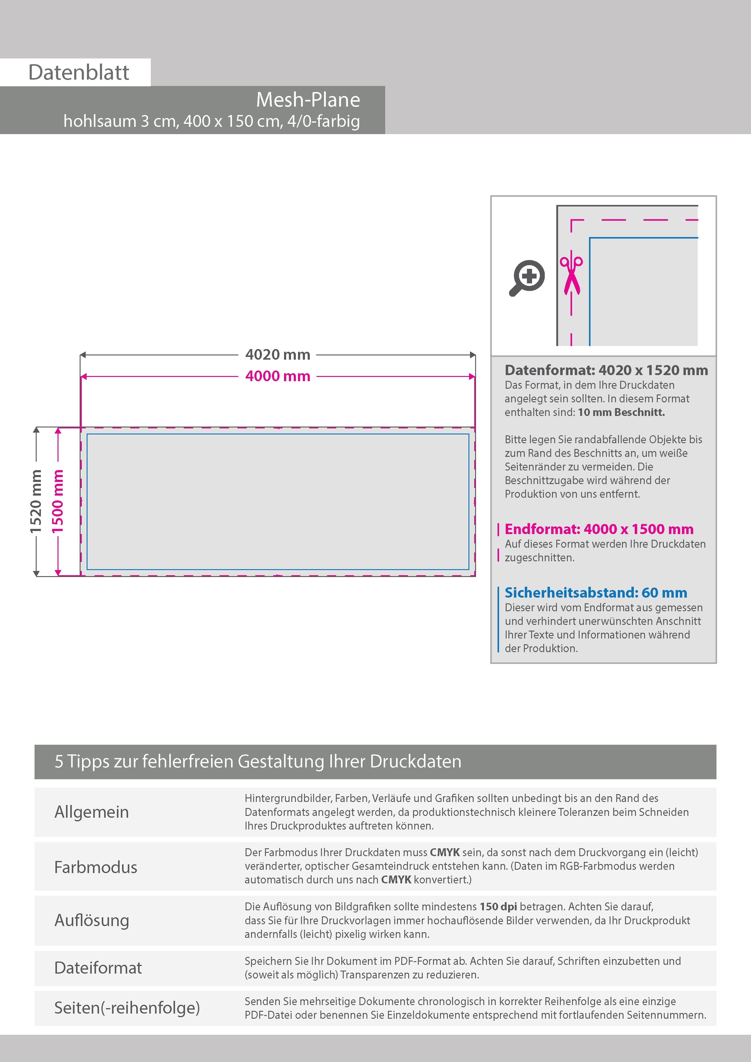 Hochwertige Mesh-Plane 400 x 150 cm, 4/0-farbig bedruckt, Hohlsaum oben und unten (Durchmesser Hohlsaum 3,0 cm)