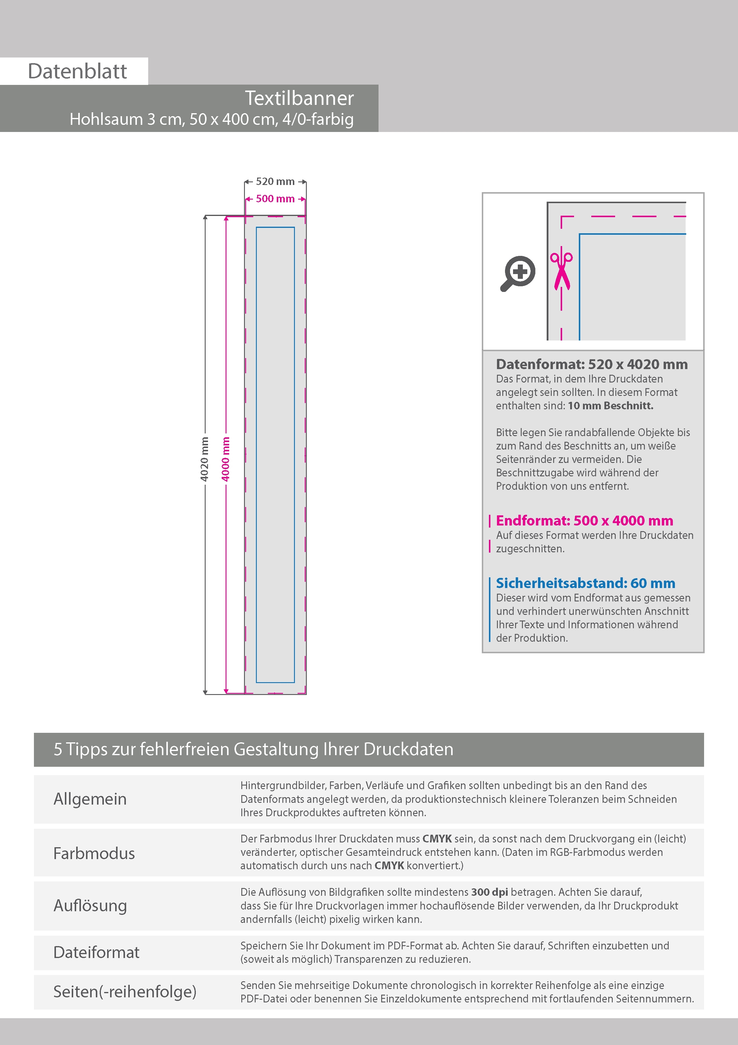 Hochwertige Stoff-Banner 50 x 400 cm, 4/0-farbig bedruckt, Hohlsaum links und rechts (Durchmesser Hohlsaum 3,0 cm)