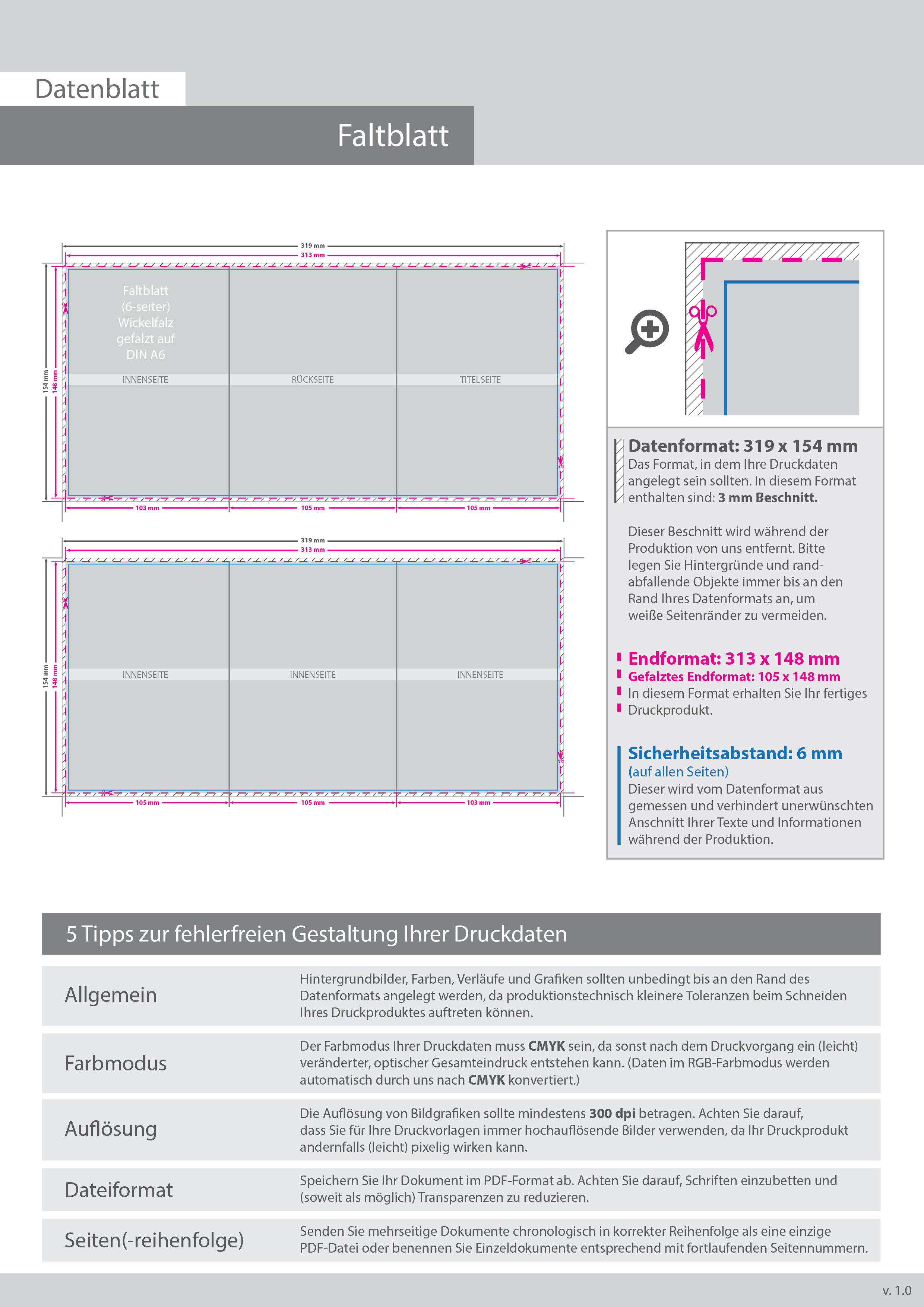 Faltblatt, gefalzt auf DIN A6, vertikaler Wickelfalz, 6-seitig