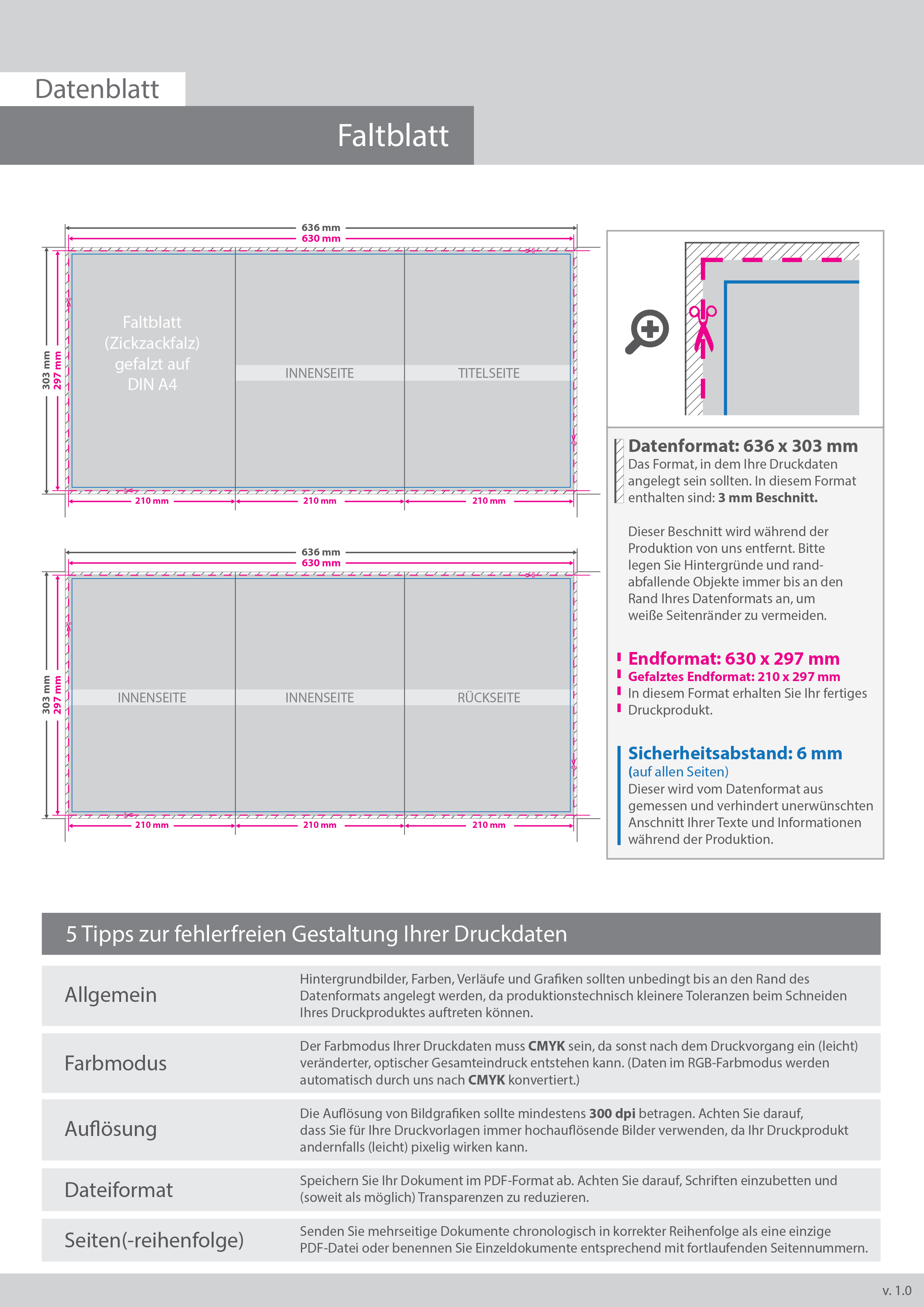 Faltblatt, gefalzt auf DIN A4, vertikaler Zickzackfalz, 6-seitig