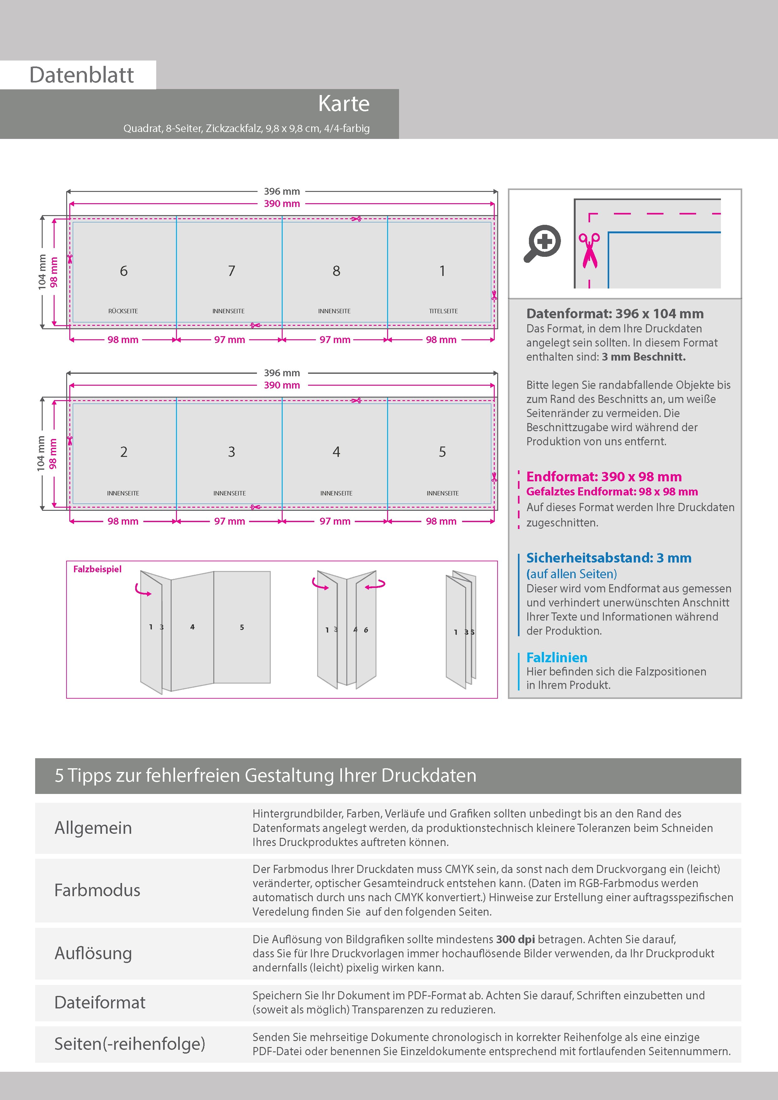 Taufkarte, gefalzt auf Quadrat 9,8 cm x 9,8 cm, vertikaler Zickzackfalz, 8-seitig