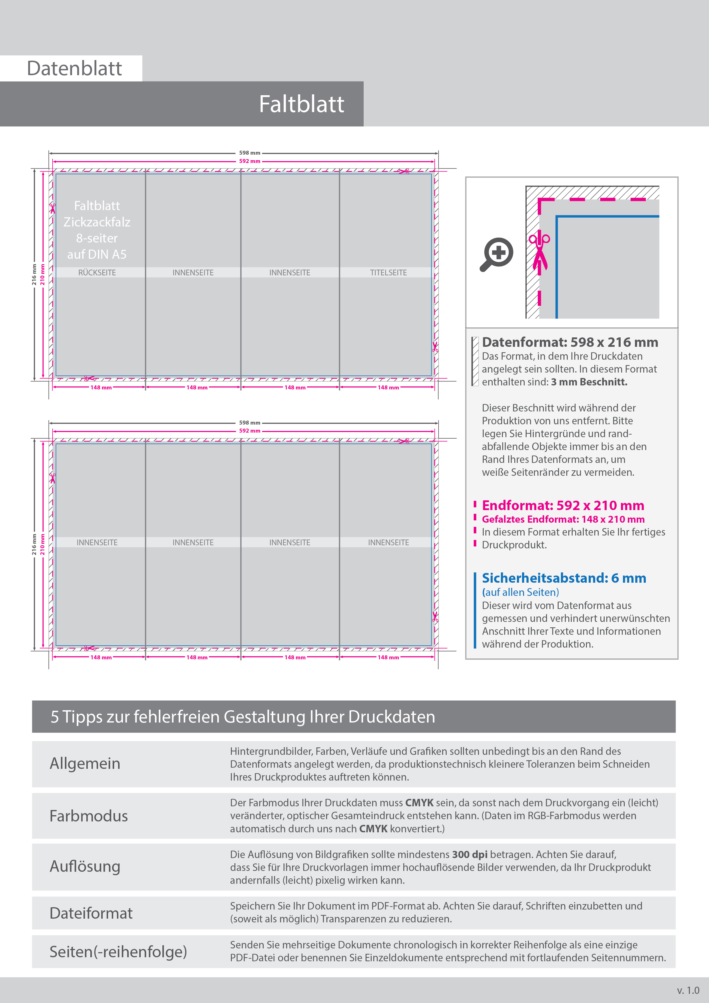 Hochglanz-UV-Lack Faltblatt, gefalzt auf DIN A5, vertikaler Zickzackfalz, 8-seitig