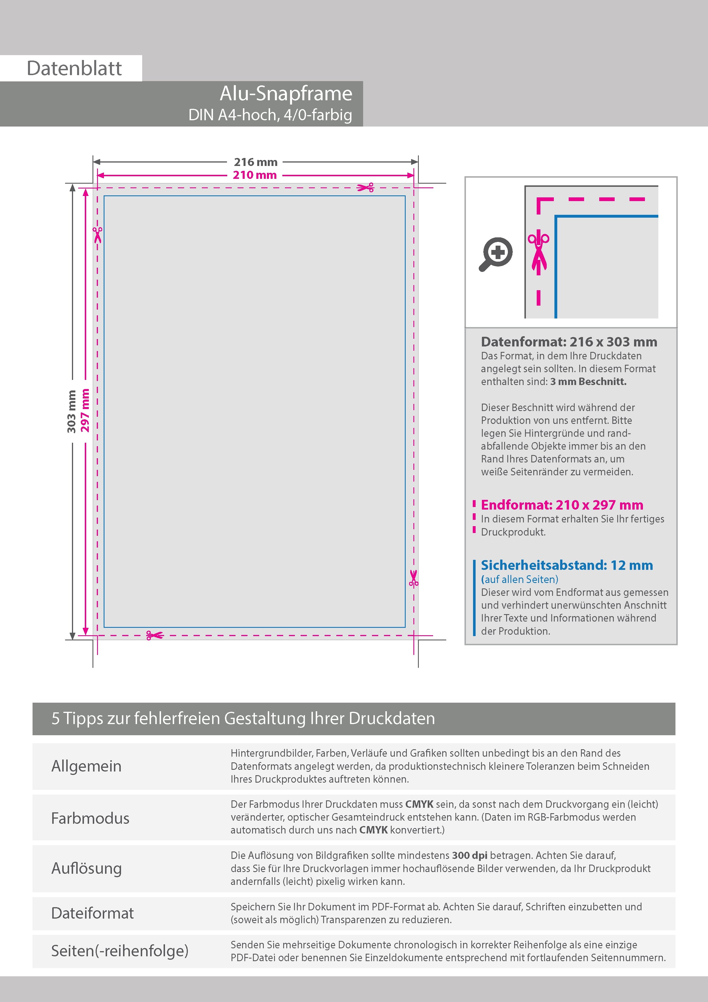 Alu-Snapframe für A4 hoch (210 x 297 mm) inklusive Druck 4/0-farbig