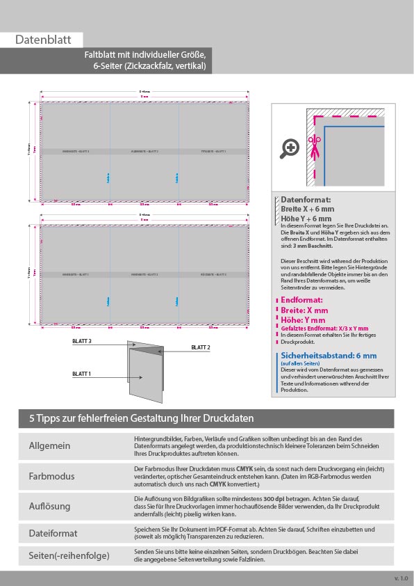 Faltblatt mit individueller Größe, 6-Seiter (Zickzackfalz), Falzung an der vertikalen Seite